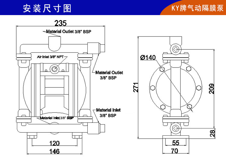 14、KY氣動隔膜泵整體構造上更加優化,泵腔和主管路都有明顯加強,自吸功能和流量揚程都有很大改善(最大流量/54立方/小時,最大揚程80米);被客戶成為超大流量氣動隔膜泵和壓濾機專用氣動隔膜泵。