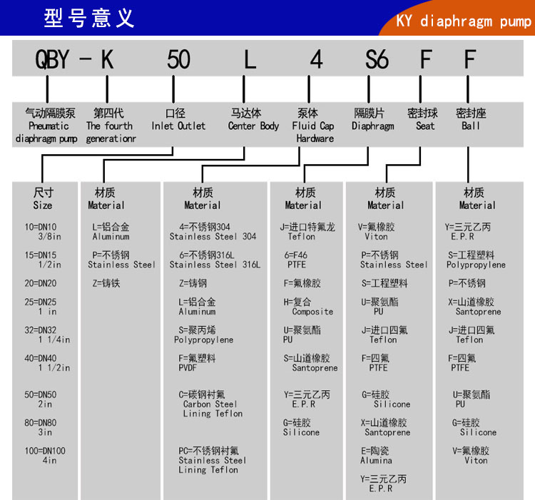 楷陽K型QBY氣動隔膜泵鑄件全部數控加工,主膜片采用特氟龍F46和進口特氟龍,副膜片使用山道橡膠和聚氨酯,替代了國產常用的四氟和丁晴橡膠等劣質易損件;密封球和密封座采用特氟龍和山道橡膠;從而大大增加了不銹鋼氣動隔膜泵易損件的使用壽命。
